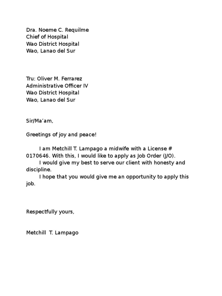 Application Letter Midwifery Job Application Examples : 3 - Be short and specific with what attracted you to the job.. Alike all other letter, job application letter or cover letter, the body of employment application letter is also separated into three sections: Any job applicant,, whether experienced or still beginners in the industry, will need to ace his or her application form. You can also check out our application letter and job application letter templates, which are also in great quality. The letter should highlight your achievements and skills, helping to get the attention of the hiring manager or recruiter responsible for reviewing applications. Learn how to write that perfect cover letter to get you the job you deserve.